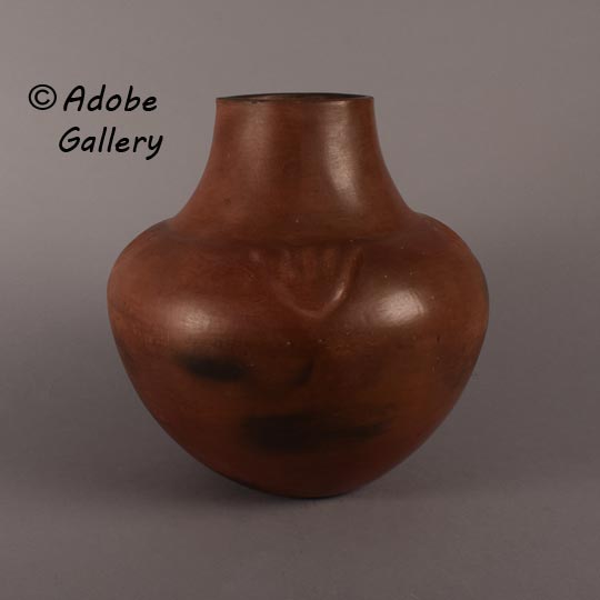 Known as a symbol of strength and healing, the bear paw is revered throughout Santa Clara Pueblo as a powerful design motif in their pottery. Legend also says that a "bear will always lead to water", so it is additionally thought of as a sign of water, indicating the hope that the jar would always be filled with water. This beautifully polished redware jar from Santa Clara contains four bear paws, each placed carefully around the wide diameter of the jar. The bear paws are impressed in traditional format, with three spots above the lower, curved part of the paw.