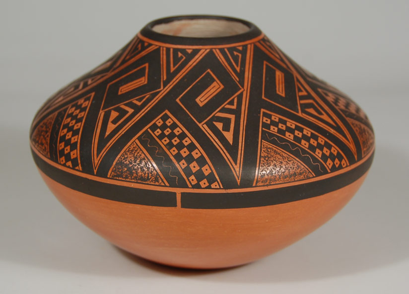Karen Abeita has certainly mastered the techniques of construction and painting as illustrated quite well in this seed jar. The jar sits upright and has the widest point at mid-body. The black painted design is most comprehensive with very little space left without design. The wide black painted hooks immediately command the viewers' attention, and then the other design elements appear as well. The checkerboard elements each have a black dot in their centers and the adjacent triangles are filled in with stippling normally applied by the tip of a brush.