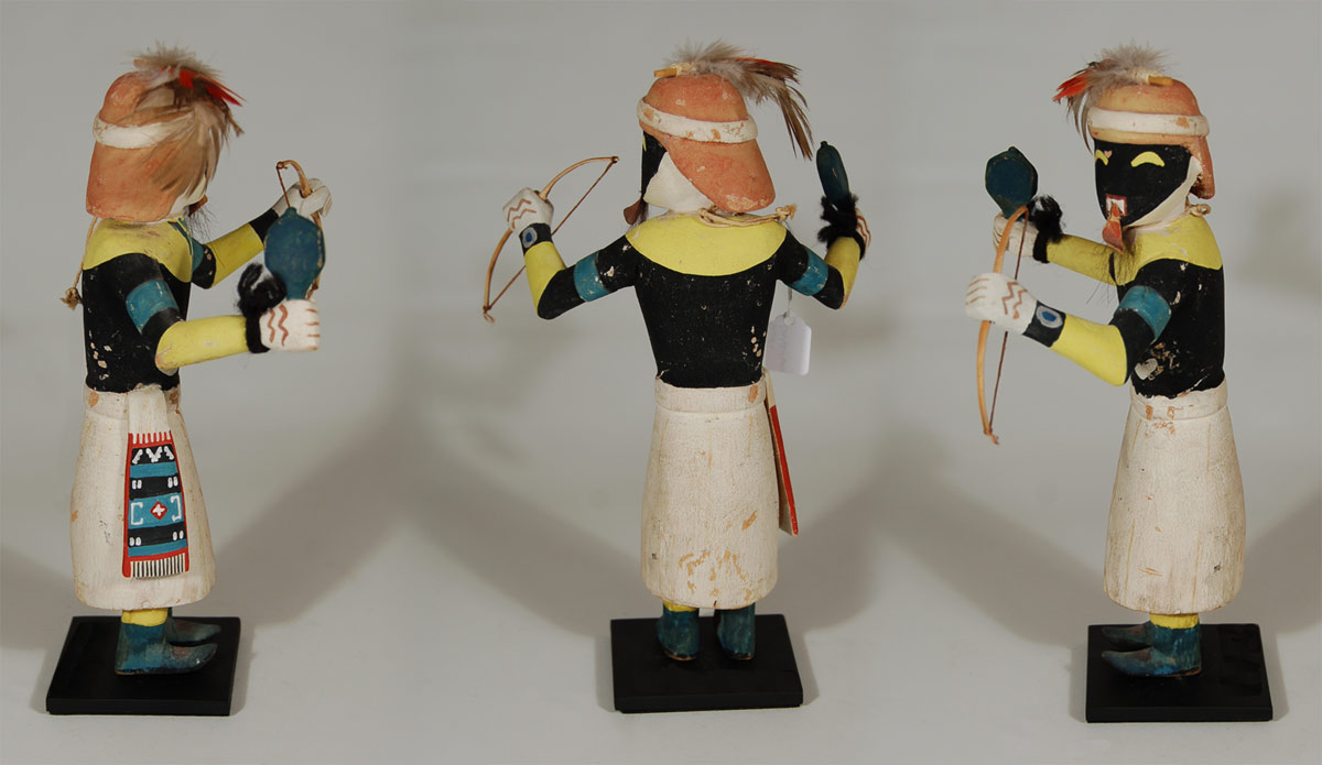 This carving is probably from the mid-20th century or slightly later. It is provided with a stand for display but the stand is removable if one wished to hang the doll from the string. This carving of Chakwaina does not show the double bandoleers, possibly the carver’s manner of carving a doll for sale that did not contain all the elements of one made for gifting to Hopi females.
