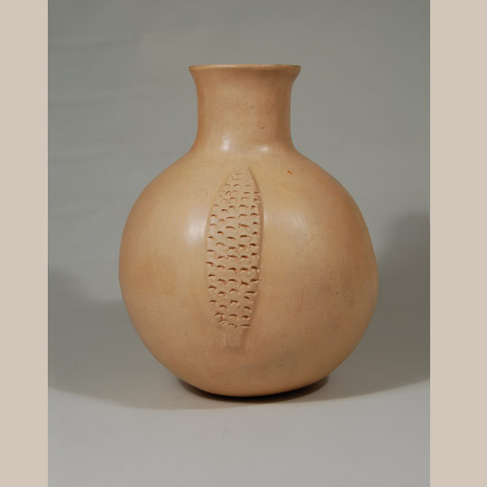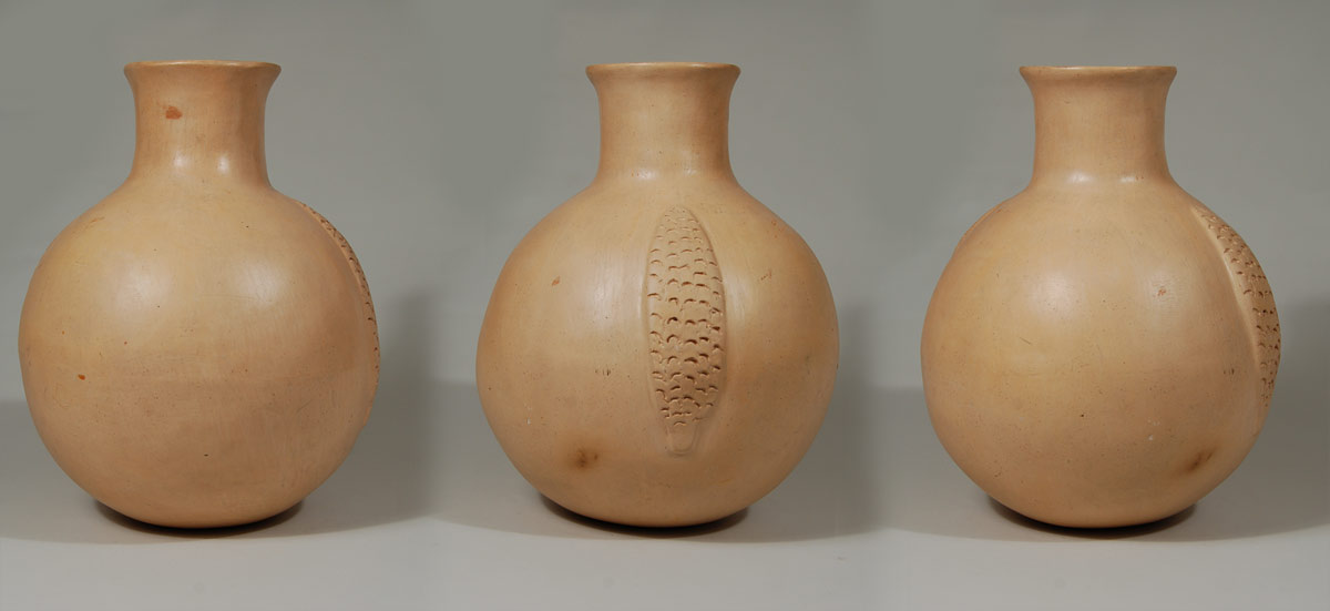 Polingaysi studied ceramics under the tutelage of Charles Loloma, famous Hopi jeweler, who taught ceramic classes at the University of Arizona, Arizona State University and at the Institute for American Indian Arts in Santa Fe. Polingaysi was a teacher and began making pottery after she retired from that career in 1954. Once she learned the techniques, she began searching for a style that suited her taste and personality. When she found uniquely special clay that needed no painted design to bring out its beauty, she decided to use only the unadorned clay and occasionally added a bas relief element such as the two ears of corn on this jar.