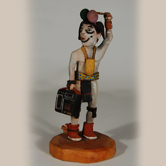 In this carving, the artist has modernized the clown by illustrating him with a boom box and flyswatter. He has a doll tied to his rear with his belt sash and she is known as his “sister.” On his head art two balloons. This clown always has black dots over the eyes and black lines under the eyes and under the mouth and black dots on his cheeks. That is traditional face paint of all of this clown style.