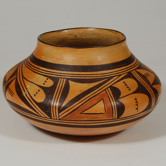 Hopi potters must be extremely pleased when their pottery is removed from the firing pile and to see that it is a beautiful blush orange. It is that orange blush that provides a warm glow to Hopi pottery which, otherwise, would be rather unimpressive. This jar has that warmth.