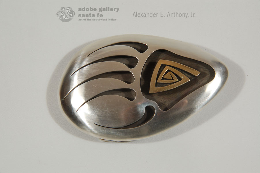 This amazing belt buckle is a perfect example of a traditional Hopi esthetic. The artist placed a cutout image of a bearpaw over a heavily oxidized layer of silver. There is a lovely spiral of gold set in the palm of the bear paw.