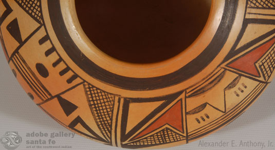 This jar has a warm gold patina from its many years of existence. The yellow color of the clay has mellowed as has the red used in the design. Often, the dark brown mineral paint rubs off on Hopi pottery so that is to be expected. Later in her career, Fannie would rub Vaseline on her pottery and polish it with nylon. I do not know if she did that as early as this jar seems to be but perhaps that is why the patina is so wonderful and the paint has survived so long.