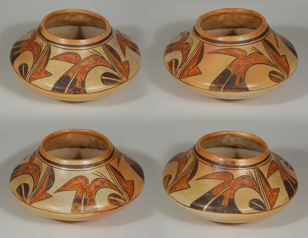 The avian designs and geometric elements point to the aesthetic of an outstanding potter and painter, whose identity will remain a mystery.