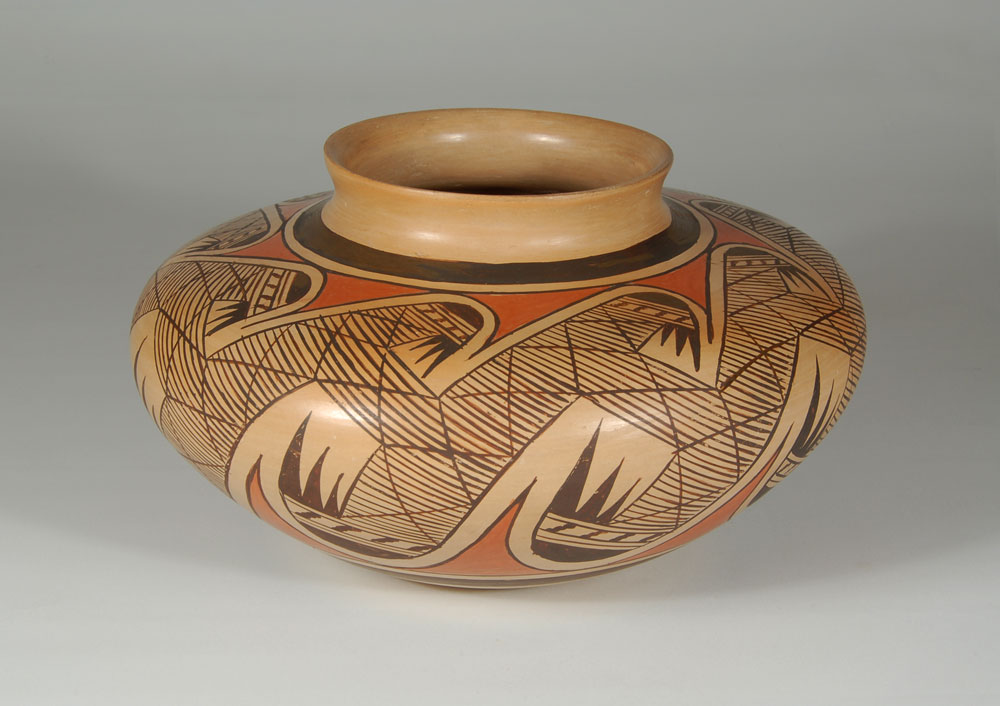 Collectors never tire of Hopi pottery with the migration pattern as it is a design that fills the area of the vessel completely and has a dynamic flow of a wave in the ocean. One can feel the motion as if the breakers were crashing against the beach. One must have a vivid imagination to feel this as there is no ocean near the Hopi Reservation.