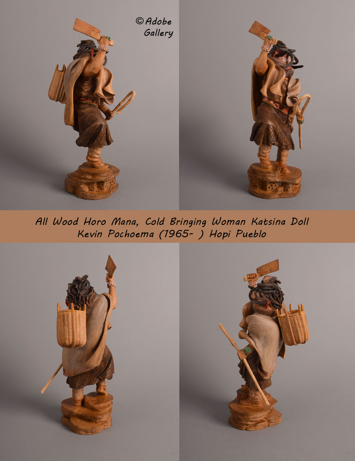 The only additions to the main carving are the basket, staff, and the feathers in her ears; all other elements were born from the original cottonwood root.