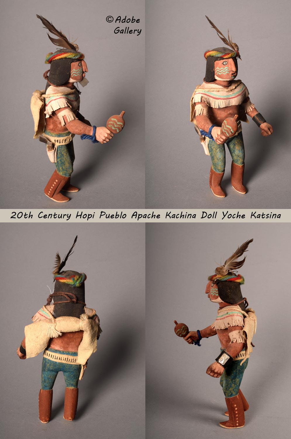 According to published information by Barton Wright, acknowledged expert on Katsina culture, the Yoche Katsina is a comic figure or caricature of an Apache Indian. It may appear during the Kiva Dances both early and late, or with the Soyohim later in the year. A group of them frequently appears in the Buffalo dances during the Katsina season. Their actions are usually those that one would expect of Apaches on the warpath. They are often used in conjunction with the clowns.