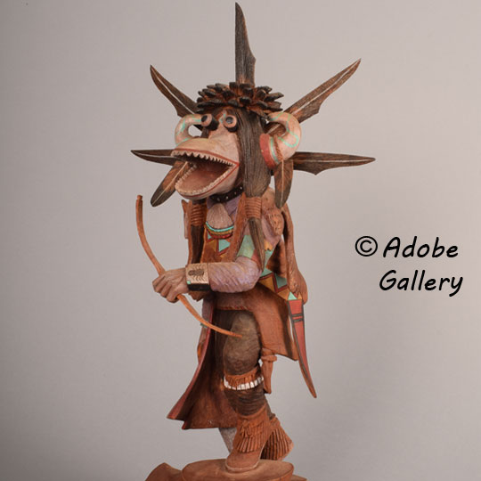 This carving was completed by Hopi -Tewa artist Samuel Neil Kayquoptewa in 1991 at which time Adobe Gallery purchased it and sold it to a client. Now it is back for us to sell again. It is basically a one-piece carving from bottom to top with certain items added separately. The obvious add-ons are the bow in the left hand, the bug eyes and the feathers on and around the head. It appears that everything else is from the same piece of wood.