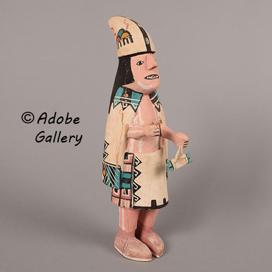 In this carving, the white line is under the left eye and not the right one. This carving has white lines on the chest which are not mentioned by Colton. He is wearing a traditional white wedding robe but this one has embroidery and I believe a true wedding robe does not. He is not barefooted as described above but is wearing moccasins. He is not carrying a bell or wand, but is carrying a prayer bundle.