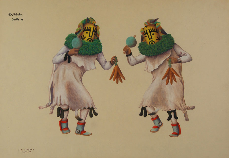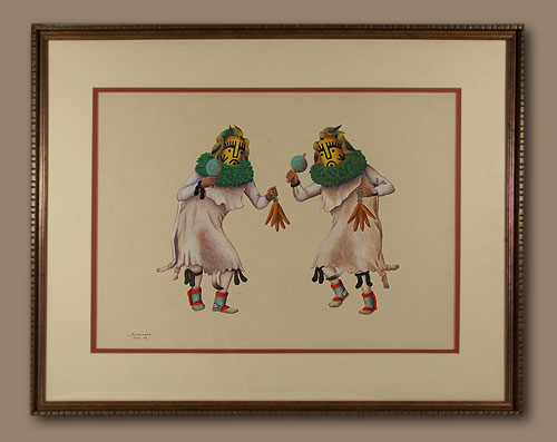 This painting of two Qöqöle Katsinas in dance position is an excellent representation of their clothing. The buckskin clothing is presented in a fashion that it appears to be true buckskin that one could touch and feel the texture. The parrots on the heads of the Katsinas appear almost real. Kewanyama was an exceptional artist and this painting is an excellent reflection of his talent. It is signed L. Kewanyama Hopi 1963 in lower left. It is double matted and framed in a wood frame.