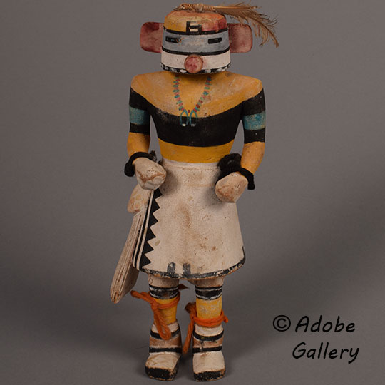 Oftentimes, these borrowed katsinas become permanent members of the adopted society and sometimes, if they seem to fail in their expected duties, they are short lived at the new pueblo. Often, they become modified in appearance or functions as time passes to make them more like the katsinas in their adopted pueblo. It is believed that this katsina was an import from Santo Domingo (Kewa) Pueblo.