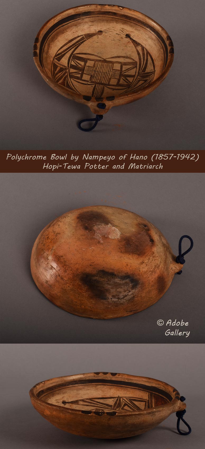 Hopi-Tewa matriarch Nampeyo of Hano created this polychrome pottery bowl. Those who are familiar with Nampeyo's work will recognize this bowl's form—the slight lip at the interior rim is a trademark of Nampeyo's bowls, as is the lug on the exterior.