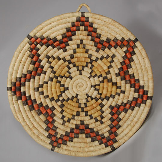 This plaque features a central design of radiating stars. The outer star consists of alternating black and red blocks and the inner one of yellowed and dyed yucca. The basket is somewhat shallow but does have some concavity. There is a loop woven into the back to facilitate hanging.