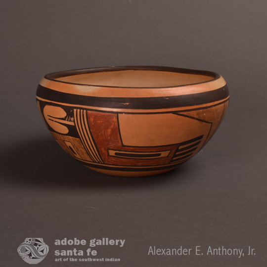 This pottery bowl made by artist Paqua Naha of Hopi Pueblo was beautifully formed with a slight inward curve to the rim. The interior was stone polished, and the exterior was stone polished and decorated with traditional Hopi symbols. The bowl was fired with a warm orange color.