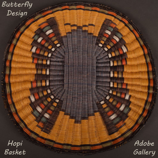 This wicker plaque basket was created by Hopi weaver Mildred Albert. Distinctive art forms are practiced at Hopi Pueblo’s three mesas. Most of the artistically inclined women of First Mesa create pottery, but some women create plaited baskets and trays. At Second Mesa, coil basketry is practiced. At Third Mesa, it’s wicker basketry like the plaque featured here. This basket’s design features a butterfly with a body made of a beautiful blue tone, the color of Hopi blue corn.