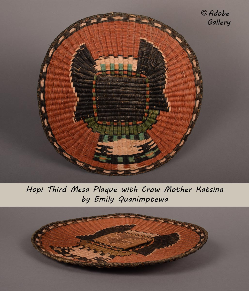 This wicker basketry plaque came from the hands of Hopi Third Mesa weaver Emily Quanimptewa. Its central design element is the Crow Mother katsina. She is surrounded by a wide band of russet orange color, a checkerboard rim band, and a black rim. In the early days, these bright colors were produced using a complex and time-consuming vegetal dye method. A wide variety of beans, seeds and flowers were used. Clay and coal were used to create white and black. Later, the weavers began using aniline dyes. They'd usually obtain these dyes from the traders who purchased their work.