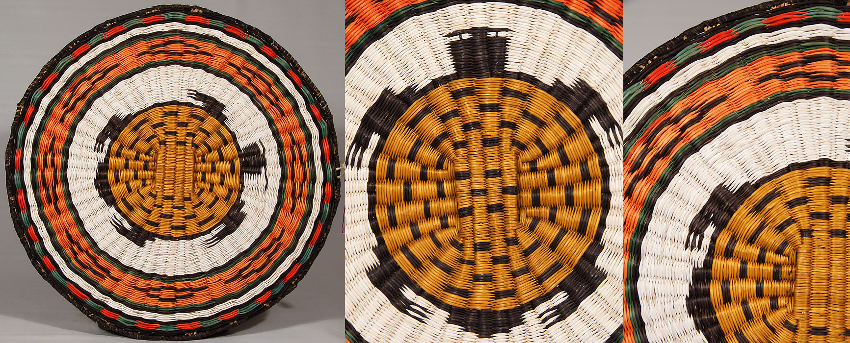 Basket weaving at Second Mesa and Third Mesa differ considerably even though the two are only 10 miles apart. At Third Mesa, the baskets are made from wild currant bush and rabbit brush. The bark is peeled from the stems or twigs and they are dyed and used whole. They derive their name from the wicker weave technique used. The edge is finished in yucca.