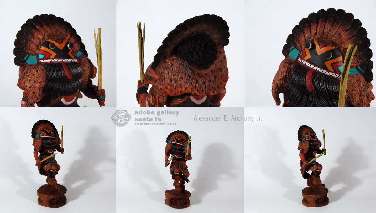 This carving was made by Kevin Pochoema, a very famous Hopi carver of contemporary Katsina dolls. He is from the village of Bacavi at Third Mesa on the Hopi Reservation. He has garnered many awards for his carvings—in 1989-92 at O'odham Tash; 1991 Best of Class; 1992 Best Concept Carving, 1st, 3rd Inter-tribal Indian Ceremonial; 1996 1st Over 15" Katina Dolls at Museum of Northern Arizona Hopi Marketplace.