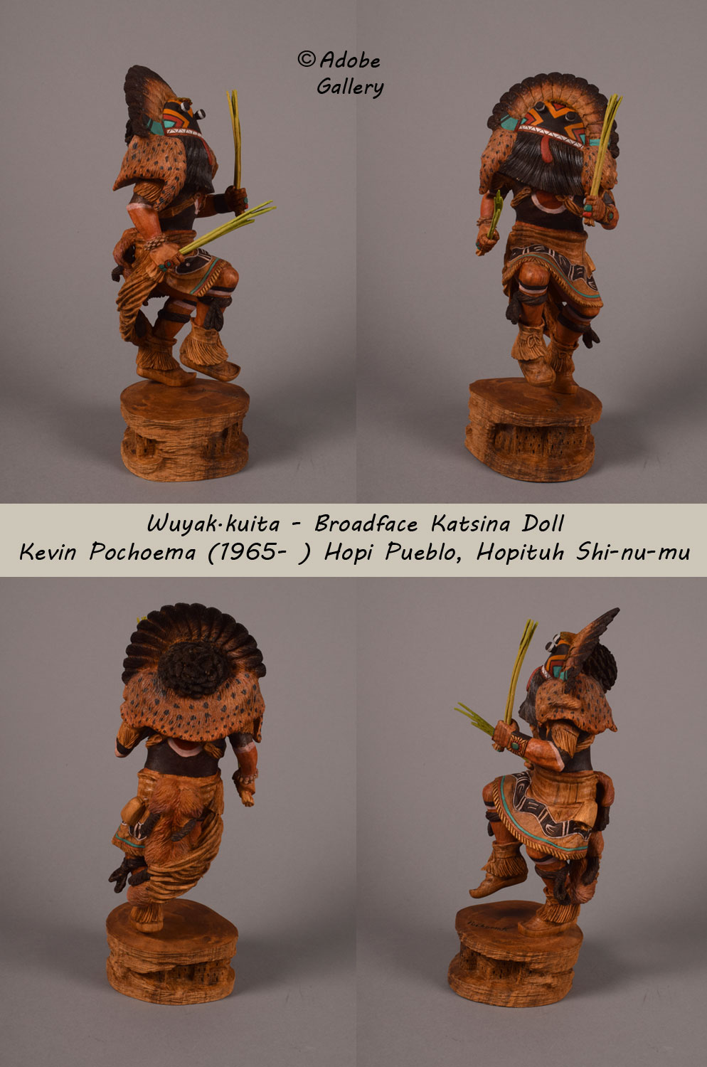 Provenance: this Hopi Wuyak·kuita - Broadface Katsina Doll by Kevin Pochoema was purchased by Adobe Gallery from Kevin Pochoema in 2018, then sold to a client from whose estate we have it back to sell again.