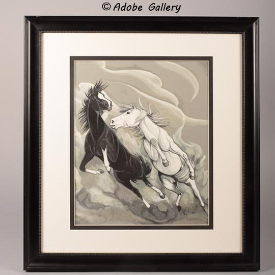 This striking black and white painting, dated 1958, captures two magnificent stallions that appear to be floating among the clouds. Artist Frank Paul Vigil presents the animals with a stunning blend of power and grace. Their manes fly as they race across the landscape, kicking up dust with a tangible sense of freedom and motion. The painting is signed and dated '58 in the lower right corner.