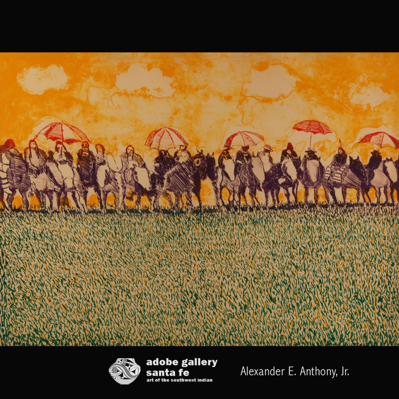 This lithograph, entitled "Indians with Umbrellas," was completed in March 1971 as a part of his Indians Forever suite. Here, Scholder uses four colors: yellow, red, green and purple. Green grass, made of short choppy lines, dominates the lower half. A washed-out yellow sky fills the top section and bleeds into the grass, adding to its texture. A long line of surprisingly detailed Indians on horses is made of bright purple, stretching across the image. Spread out among the people are five bright red umbrellas. It is incredible that Scholder created such complex compositions during his first year as a lithographer.