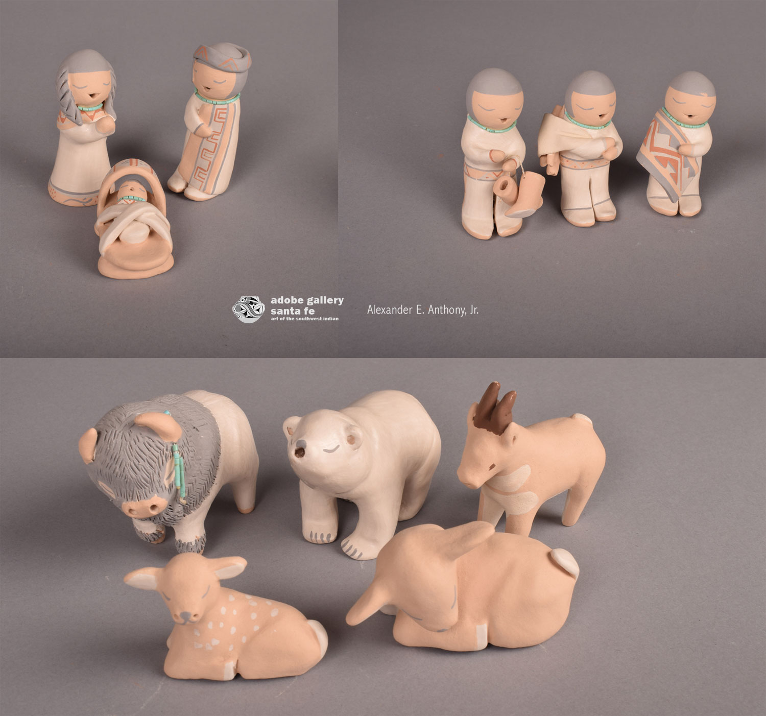 This nacimiento by Isleta Pueblo artist Stella Teller consists of twelve individual pieces. There is the three-piece Holy Family—Jesús, Mary and Joseph. Baby Jesús is wrapped in a blanket and snuggled in a cradle board. He is wearing a turquoise coker. Mary is standing and wears a finely decorated dress, a turquoise necklace, and has her hair in braids. Joseph is standing, wrapped in a blanket which is secured by his hands, and he wears a turquoise choker and traditional moccasins.