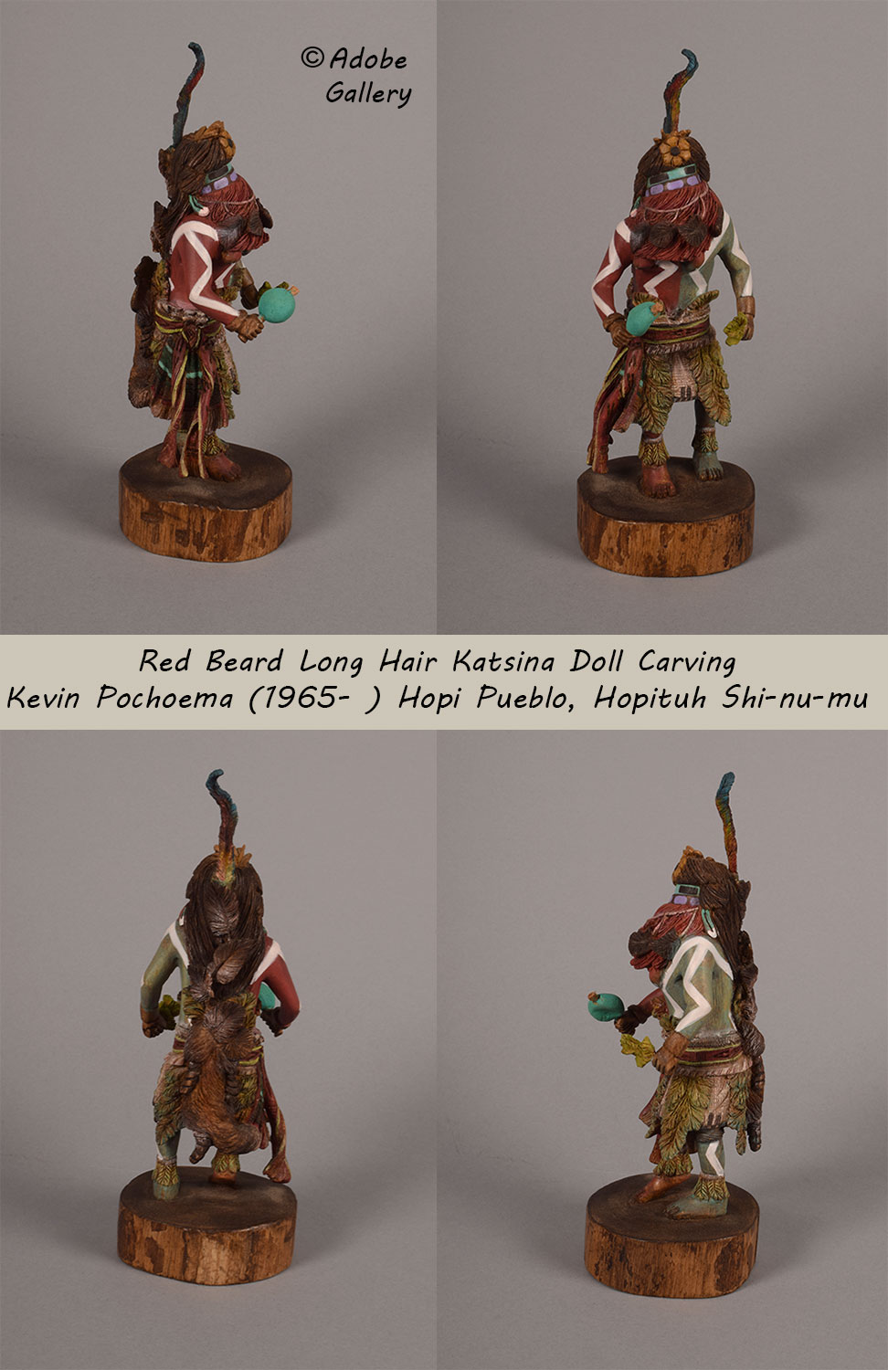 This exceptional Red Beard Long Hair Katsina is a masterpiece carving by the renowned Hopi artist Kevin Pochoema. Pochoema is known as a perfectionist whose dolls capture the true, dynamic appearance of the dancers, often recalling the experience of seeing the ceremony in person. This carving showcases Pochoema's dedication to perfection. It is executed as a single-piece carving, with the only exceptions being the tall feather on the head and the items held in the Katsina's hands.