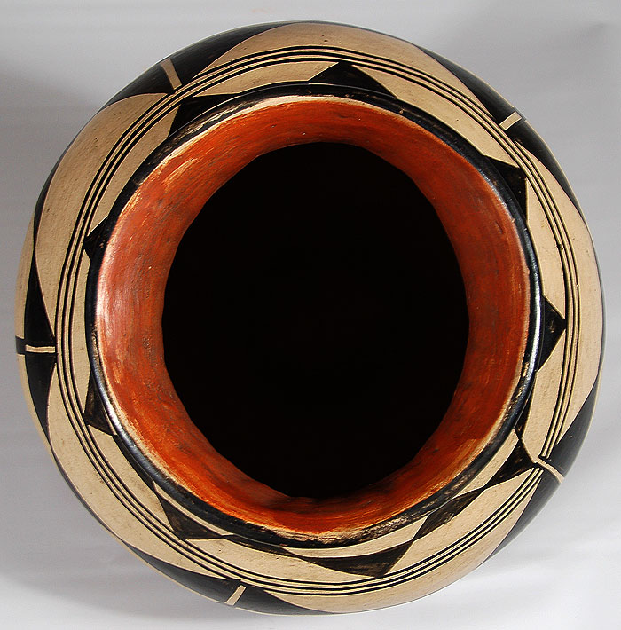 Kewa Pueblo potters developed a strong bold form of ornamentation in black on cream-colored background, with only a red band under the decorated area. Red was not used in the design pattern. The design basically consisted of simple geometric patterns repeated around the vessel body. Neck zones usually had elements in repetition as well.