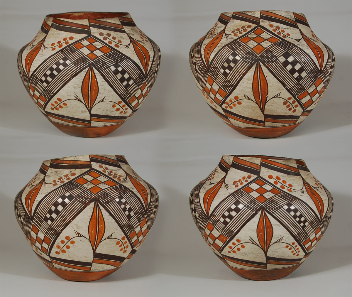 This work is perfectly typical of Laguna ceramics, in form, construction, materials, and design execution. The parallelogram bars are very typical of Laguna Pueblo design elements, as are the plants with berries. The plants with berries are a feature taken by Laguna potters to Isleta Pueblo when they migrated there in 1879.