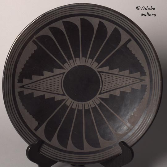 This large Black-on-black pottery plate was made by Maria Martinez and beautiful designs were applied by Julian Martinez around 1927. Maria made this in the depth of a shallow bowl which elevates the design so that it is more visible for viewing. It's subtle things like this that make the manufacture of pueblo pottery an art form. Thought is always given when making pottery as to the display of the design. Additionally, a shallow shape fires safer than a flat shape. A flat tile of this size would most likely crack during the manufacture whereas the shallow bowl is stronger during drying and firing.