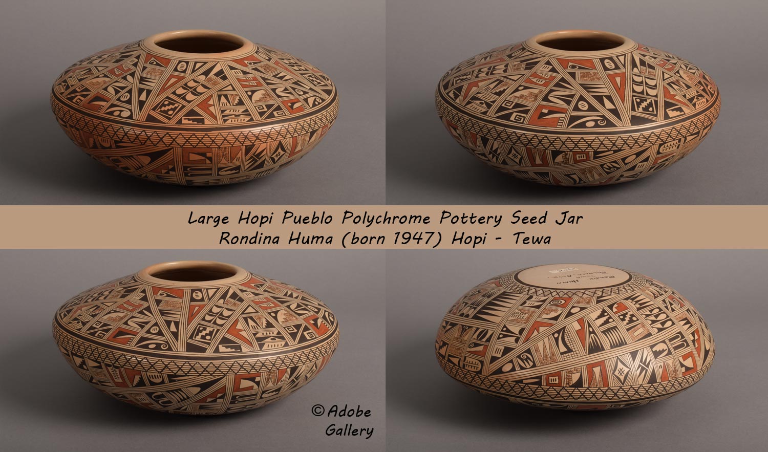 This large Hopi Pueblo polychrome seed jar illustrates exactly why work by Rondina Huma are so highly collectible. The vessel itself, clearly crafted by the hand of a master potter, is beautifully shaped and smoothly polished. Viewing it from a variety of directions reveals near-perfect symmetry. Its straight shoulder and shallow, curved underbody are consistent all the way around the vessel, which is rare in jars of this size.