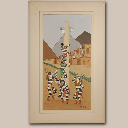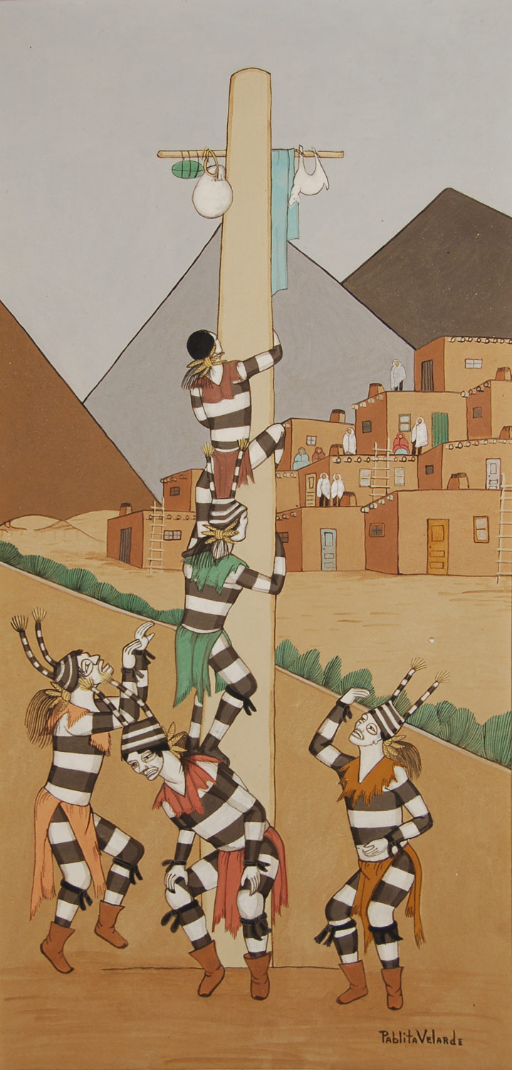 This mineral earth pigment painting is an illustration of the Koshare clowns at Taos Pueblo climbing the pole to get to the treasures at the top. This is an event undertaken every year on the pueblo’s feast day as well as at other times, particularly at the Christmas season.
