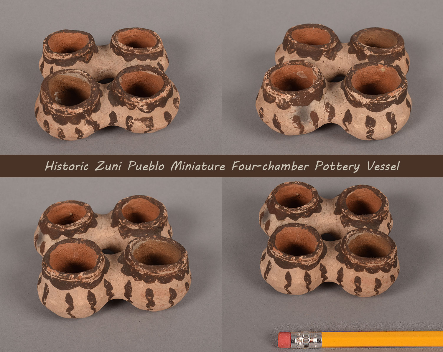 This intriguing and rare pottery vessel is a masterclass in Zuni Pueblo's early 20th-century craftsmanship. Composed of four individual bowls joined at their exterior walls, the piece creates a singular, unified form while maintaining four distinct, independent chambers on the interior.