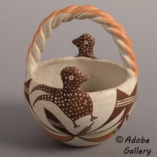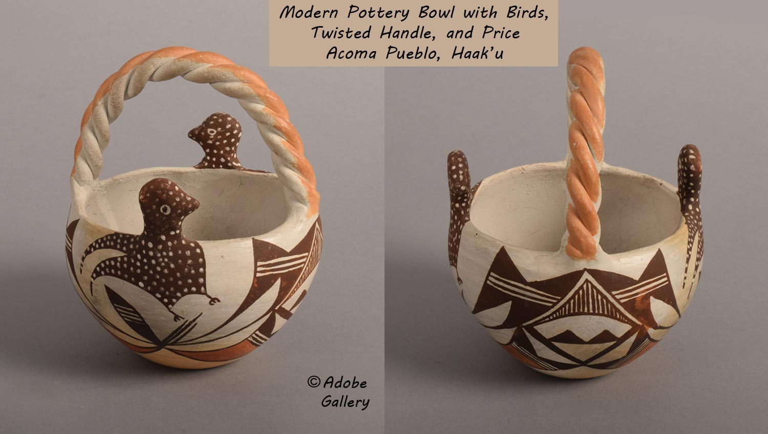 Provenance: this Modern Acoma Pueblo Pottery Bowl with Birds, Twisted Handle, and Price is from a client of Adobe Gallery