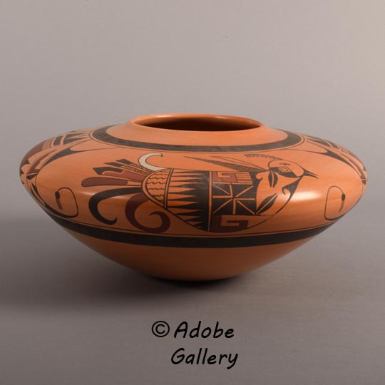 Another innovation by Mark is his choice of clay. The artists at Hopi have a choice of clay from the Jeddito region, just behind the village of Polacca, or Sikyatki clay from the prehistoric ruins so important to the career of Nampeyo. In this jar, Mark selected clay from Jeddito which fires to a beautiful orange blush.