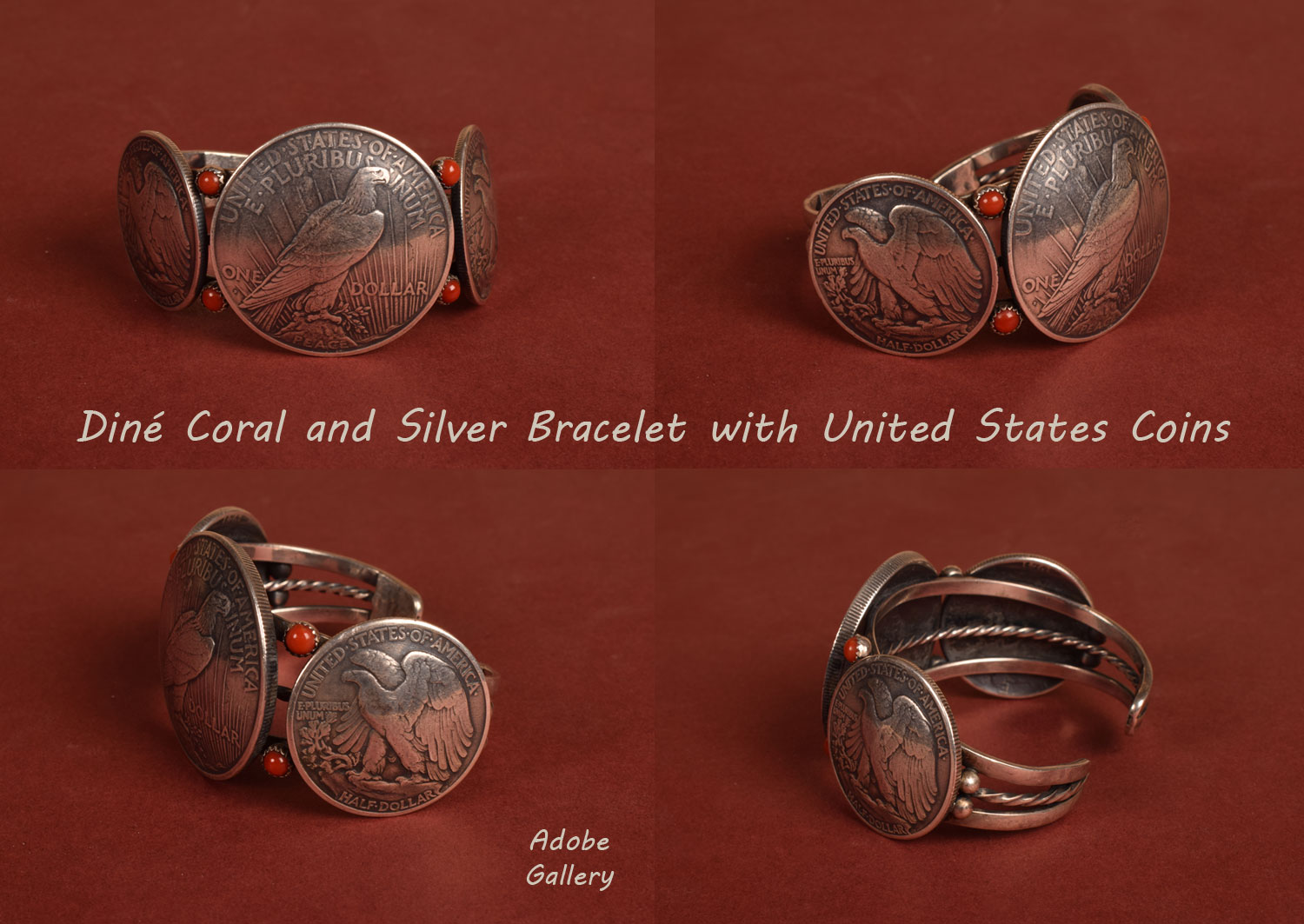Use of United States coins was popular during the 1960s-70s and that is likely when this Navajo silver and coral bracelet was made. Around 1969, a national fad was in vogue for Native American jewelry. Many entertainment personalities started wearing Indian jewelry, bringing attention to its appeal. High fashion articles depicting the finest Indian jewelry on beautiful models appeared in magazines, such as Vogue. This increased the demand for handmade Indian jewelry. Using coins on bracelets eliminated the need to work with gemstones such as turquoise and, yet, produced a significant item that was attractive and patriotic.