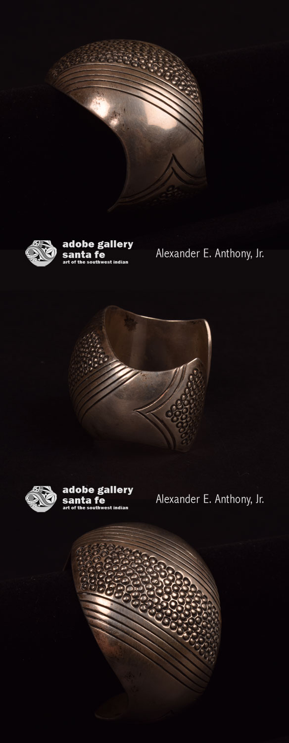 This bracelet illustrates his talent, both in creative innovation and skill as a silversmith. The bracelet is signed with “Orville Tsinnie, New Mexico” along with two stamps of Shiprock.