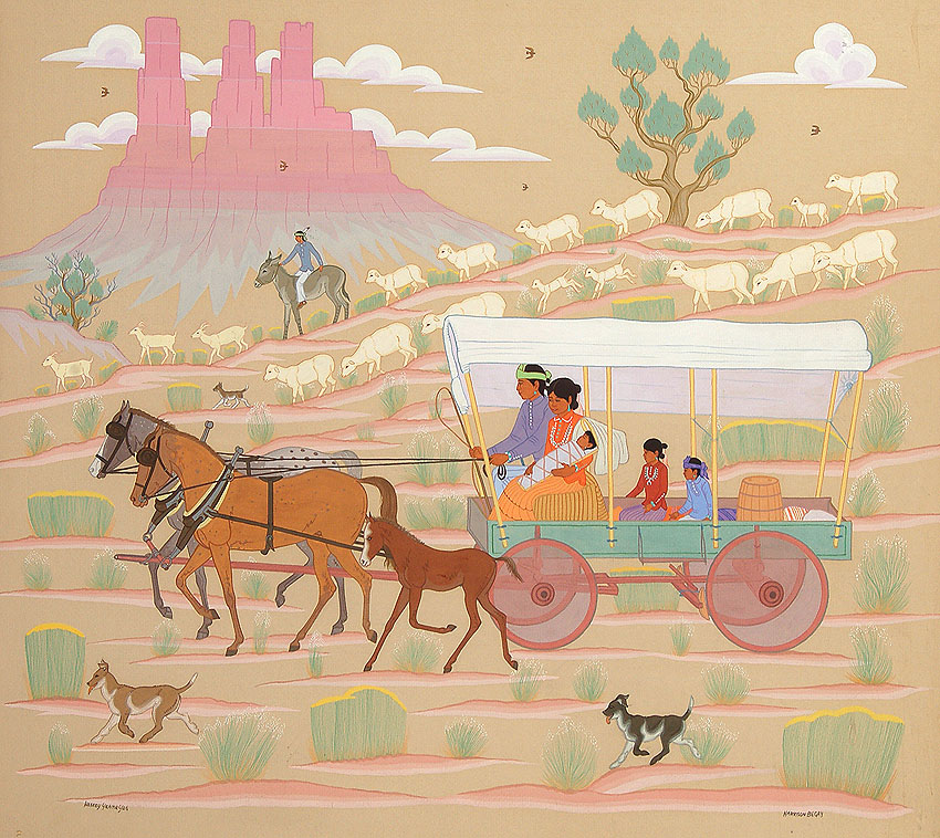 Harrison Begay was born in 1914 on the Navajo (Diné) Reservation. He attended the Santa Fe Indian School and studied under art teacher Dorothy Dunn. His distinctive style of painting has been popular for over 75 years. His art has influenced an entire generation of Native American painters. Begay spent his career painting scenes of everyday life among his people.