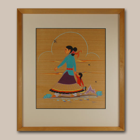 Most of Beatien Yazz's work reflects the everyday lives of the Navajo. It is not always obvious when he is picturing secular life-ways or religious life-ways, but in this instance, it is clear that the Navajo woman is out walking with her daughter, both in fine traditional clothing. Her velveteen blouse has silver button at the cuffs and her skirt is flared out at the bottom. Her hair is in a chonga and she is wearing traditional buckskin moccasins. The young daughter is clutching a doll.