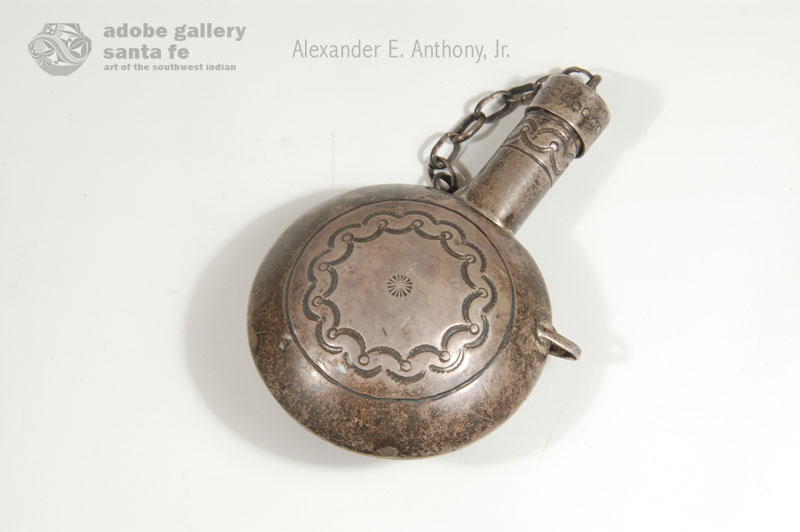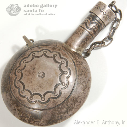 According to John Adair’s classic book Navajo and Pueblo Silversmiths (see reference link below), the origin of tobacco canteens, like other Navajo pieces, was Mexican. Mexican tobacco containers were made of rawhide and had a round shape with a wooden stopper. Mexican plateros also made copper and silver canteens, but their shapes were different. Though it is not certain exactly where the inspiration for silver canteens the Navajo made came from, it is known they were making them by 1880. Washington Matthews, an Army officer at Fort Wingate, described silver canteens being made by the local smiths.