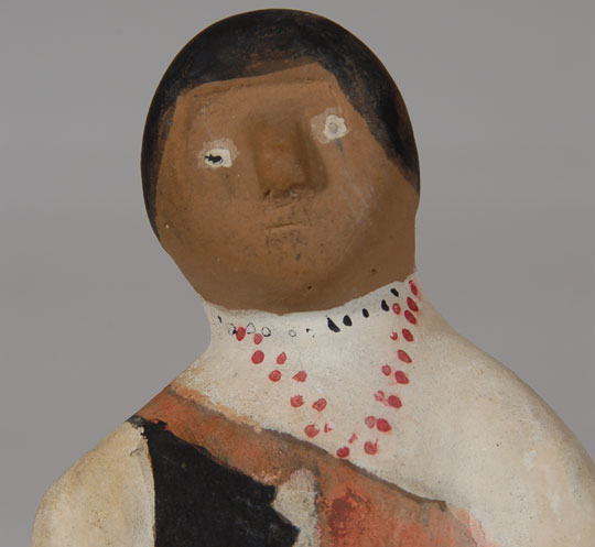 This standing female figurine is not signed with an artist name but we believe it is from Ohkay Owingeh Pueblo, an assumption based on having seen similar figurines in the past. The brown clay figurine was painted in white paint and her traditional Pueblo dress painted in pink and black, the pink being a shawl draped over the black dress.