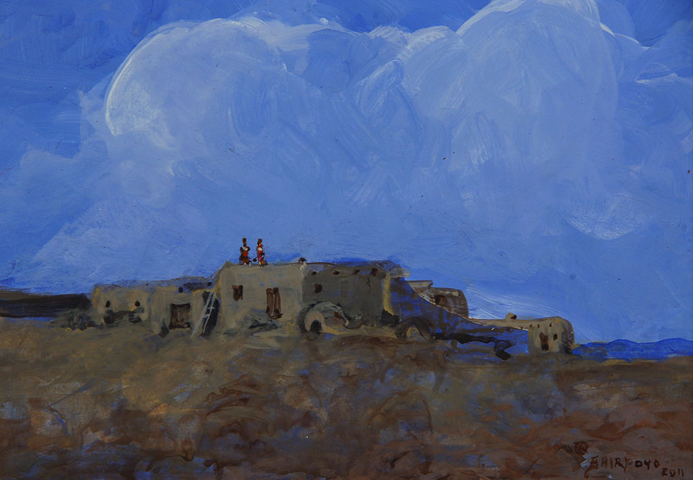 Isleta Pueblo artist Ed Jojola has the magical ability to incorporate an entire slice of pueblo life into less than 35 square inches. This window into life at Isleta shows 2 natives of the village, wrapped in a colorful blanket, standing on rooftop contemplating the possibility of rain—something very rare in New Mexico.