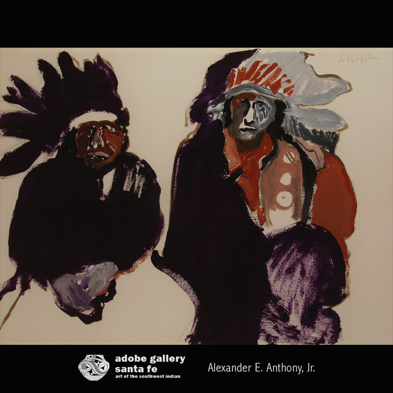 This painting was completed in the late 1960s, when Indian subject matter was still fairly new territory for Scholder. The handmade Arches paper, which is embossed “VERITABLE PAPIER D’ARCHES FIN,” is framed beautifully and mounted with its edges exposed. It is signed by the artist in the upper right.