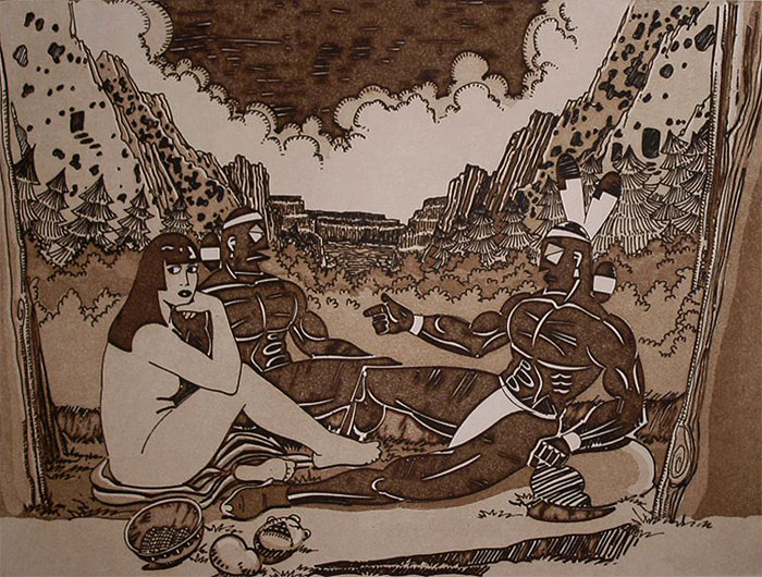 In this etching, "Luncheon in the Canyon," Diego Romero has made a classical reference to Edouard Manet's "Luncheon on the Grass." Romero has used two well-muscled men with faces from Mimbres pottery designs and a nude version of the Pueblo Corn Maiden as participants in the picnic. Romero has named the two males the Change Brothers and they are, in fact, based on Diego and his brother Mateo.