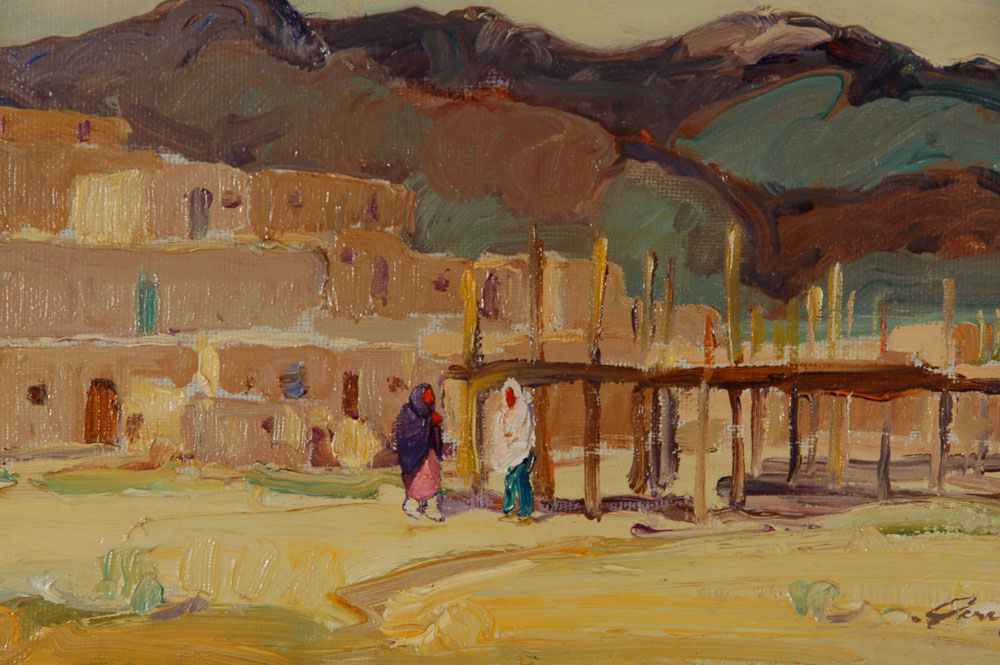 This oil painting of a day in the life of Indians at Taos Pueblo easily portrays the serenity of the village. Jordan, through his brush techniques and use of color, displays life in Northern New Mexico in a realistic manner-a manner that makes one want to live there.