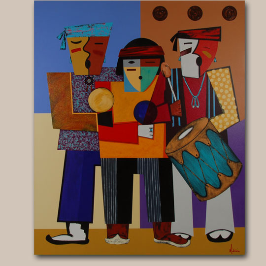 In this spectacular painting, Maktima has depicted three members of the chorus as they participate in a traditional Pueblo ceremony. The artist has rendered a traditional event in a cubist, modern way. The painting shows the influence of Maktima’s time at IAIA where he was introduced to the work of Picasso and other modernists. Picasso’s “Three Musicians” at the Museum of Modern Art in New York shows three musicians in flat, boldly colored, abstract shapes. Maktima’s trio is similarly rendered using a combination of geometric shapes and lively color in a flat composition; but the artist has not forgotten to include traditional elements of the Pueblo culture. While the image may be thoroughly modern, there is no mistaking it is of a Pueblo ceremony. The drum, the rattles, the clothing, moccasins and turquoise jewelry are all uniquely Pueblo.