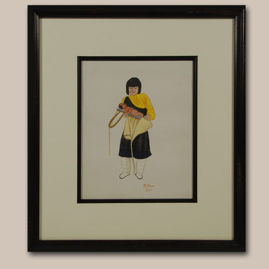 Rafael Medina (1929-1998) Teeyacheena painted this image at the age of 23 years. It represents the first exposure of the newborn to the outside world and might be the day of the naming ceremony of the baby. It is a watercolor on paper and recently framed using acid-free materials and a dark brown wood frame.