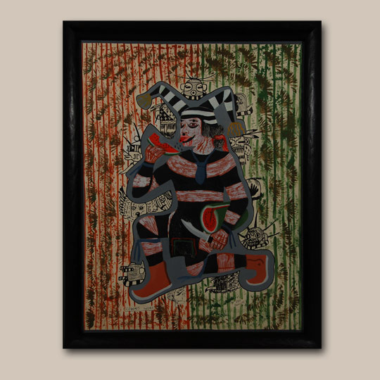 In this painting, Phillips features a Koshare Clown kneeling and eating watermelon and spitting out seeds. Surrounding this image, he has drawn, in black, faces of various Katsinas. He has inscribed “Clowns World” below the clown. The painting is signed in lower right. It is framed in a new black wood frame, without the use of mats. Spacers between the painting and glass separate the painting from touching the glass.