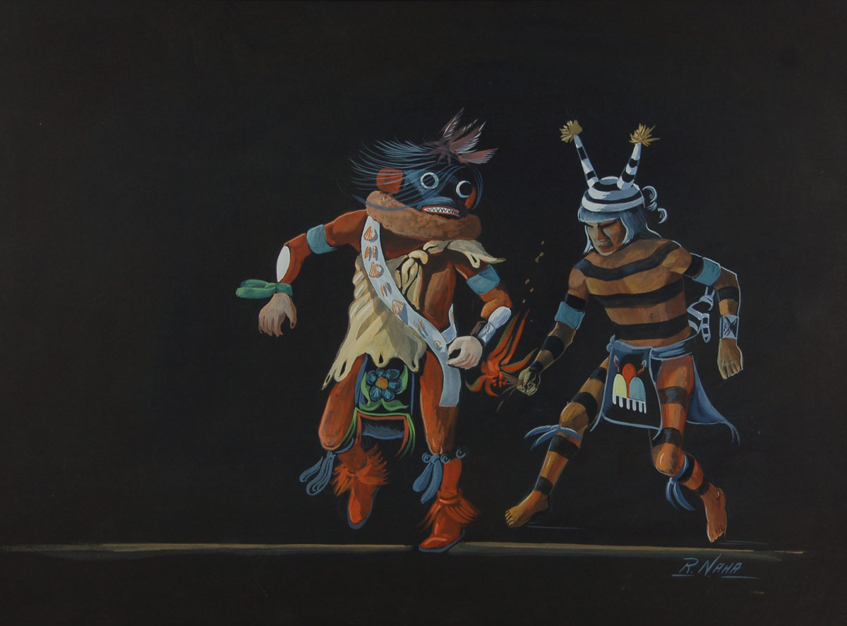 Raymond Naha captured the moment when a Koshare, with a flaming fire stick, is harassing an Ogre Katsina. Chaveyo is an Ogre Katsina represented in all Hopi villages but it is believed he migrated from the Ohkay Owingeh area of New Mexico. He is somewhat a disciplinarian to the Hopi in that if a Hopi fails to meet his obligations in community work or transgresses the rules of conduct of Hopi life, then Chaveyo will show him the error of his ways.